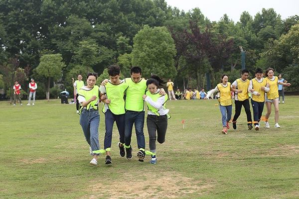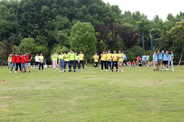 第二個比賽是四人五足,顧名思義,就是每組派出4名隊員參加,用游戲道具將4個人的腿兩兩綁在一起,四人并行,先到終點的隊伍獲勝,這個游戲考驗的就是每組隊員配合的默契性,不是一個人跑的快就可以,一定要和大家步調一致才行。紅隊的四個隊員邁著整齊的步伐,喊著響亮的口后,雖然一開始他們并不是最快的,但是他們一直跟隨著自己的口號節奏,逐步趕上前面的隊伍,有的隊伍一開始很快,但是缺乏口令,走著走著步調就不一致,有的隊伍中的隊員自己很著急,步子邁的很大,沒有顧及到其他隊員,導致摔倒或道具掉落,按照游戲規則要調整好了才能繼續比賽。最終紅隊獲勝。這個游戲就是告訴我們在工作中需要相互配合,才能完成任務,很多事情不是你一個人就可以,個人英雄在企業里是不存在。