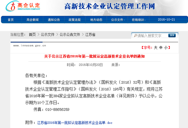 作者:南京科進 瀏覽:201 發布時間:2016/10/24 11:49:162016年10月21日,江蘇省2016年度首批認定的高新技術企業名單公布(見附件309號),包括南京科進實業有限公司在內的384家企業榜上有名。